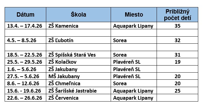 Prehľad uskutočnených a plánovaných plaveckých výcvikov pre rok 2026: